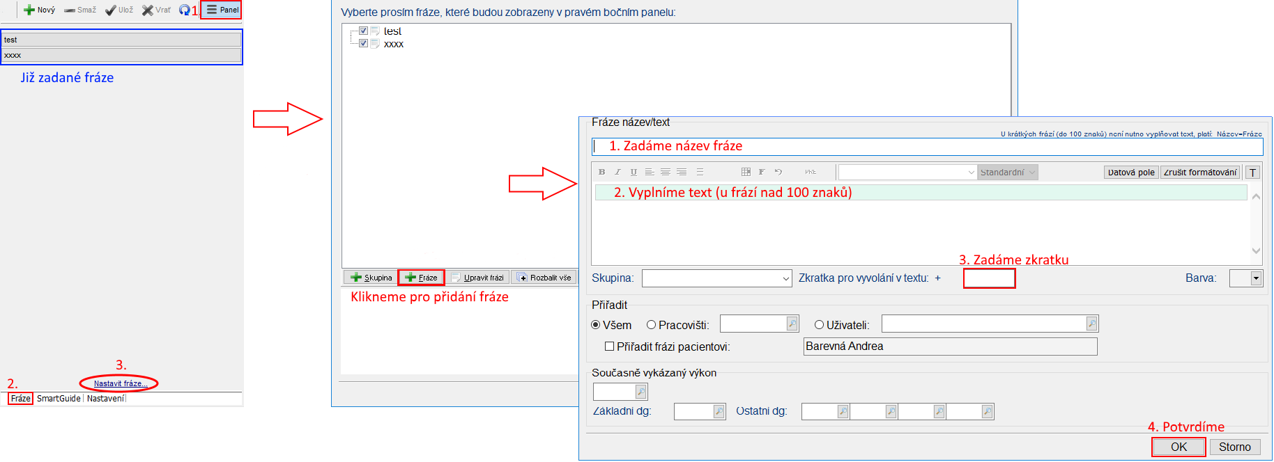 1. Přímo u pacienta v dekursu pod tlačítkem  .  Dole vybereme záložku Fráze a následně klikneme na modrý odkaz "Nastavit fráze...". Otevře se nám nové okno, kde klikneme na  Fráze a otevřeme tím editovatelné okno, kde vyplníme název fráze, vlastní text fráze pokud je delší a nestačí jej zadat pouze formou názvu, a zkratku fráze.