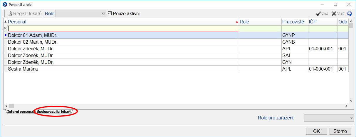 Výběrem hlavní role "ošetřující lékař" se tato role nastaví pro celé oddělení.