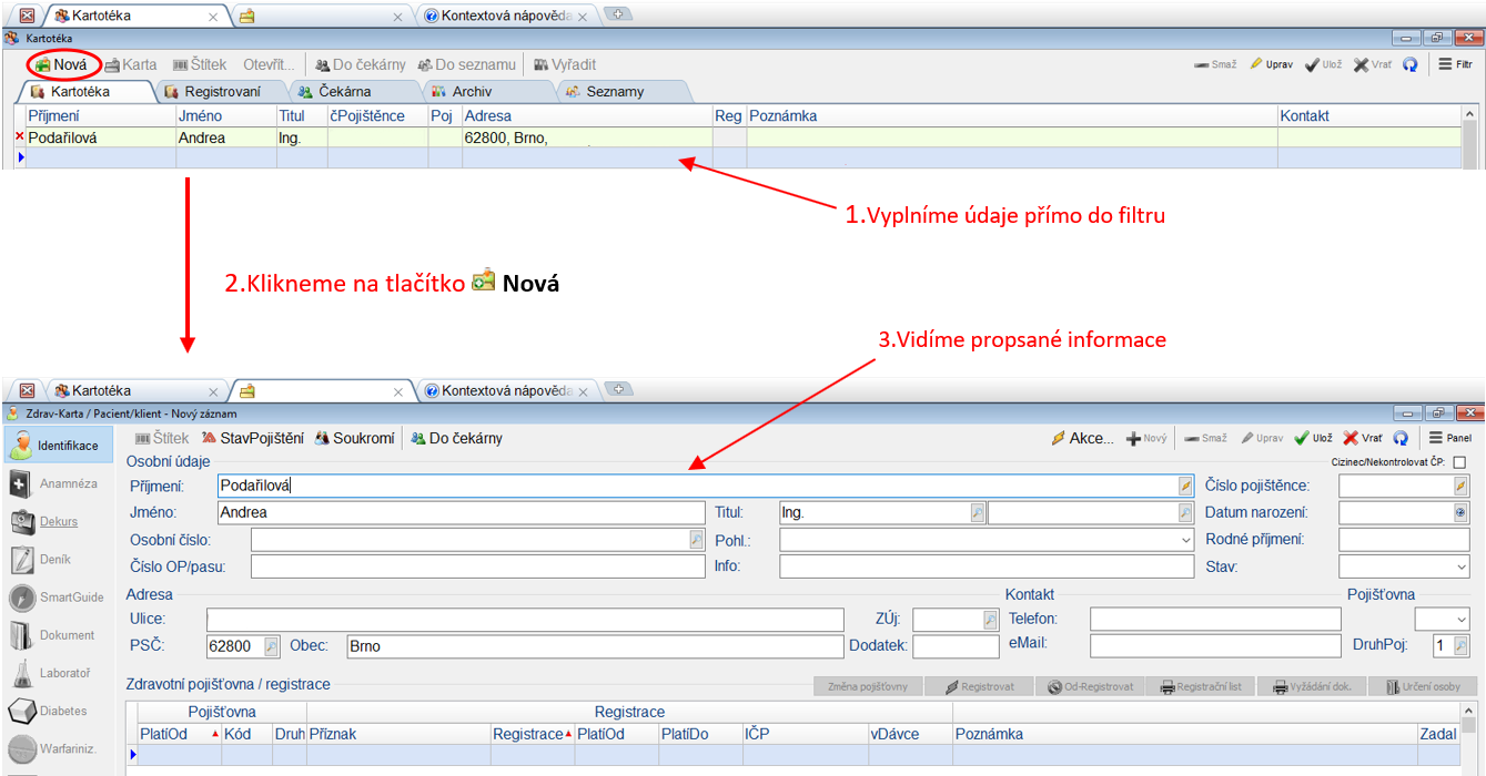 Začneme vypisovat údaje přímo v kartotéce do filtračního řádku -> příjmení, jméno, pojišťovna, adresa a až poté klikneme na tlačítko   Nová. Tyto zapsané údaje se nám automaticky doplní do identifikace. Pokud chceme rozdělit směrovací číslo, město a ulici do příslušných kolonek, musíme oddělit údaje čárkou (např. 100 00, Praha, Horní 10).