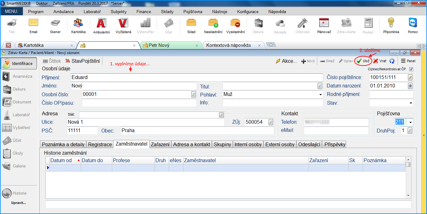V kartotéce klikneme na kartu   Nová. Vyplníme jméno, rodné číslo, pojišťovnu a kontaktní údaje pacienta. Mezi jednotlivými poli se můžete posouvat myší, nebo pomocí kláves ENTER a TAB. Vyplněné údaje uložíme kliknutím na tlačítko   Ulož, stiskem klávesy F12, nebo prostým zavřením karty.