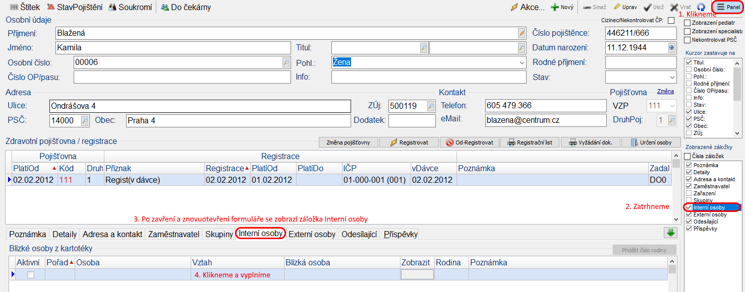 vpravo nahoře a v zobrazené nabídce zatrhnout políčko Interní osoby. Záložka se nám zobrazí až po zavření a znovuotevření formuláře. Po otevření záložky Interní osoby stačí kliknout do světle modrého řádku a vyplnit požadované informace.