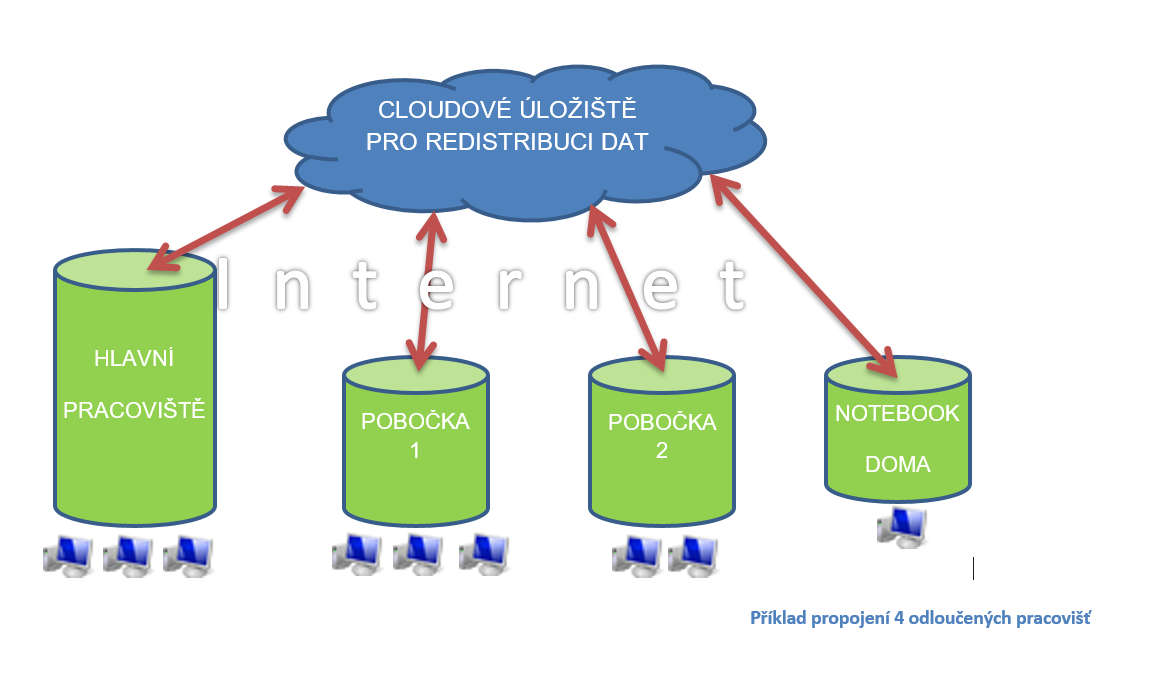 Replikace dat slouží k datovému propojení dvou a více vzdálených pracovišť. Uživatelé každého pracoviště pracují s lokální databází. Systém zaznamenává veškeré změny dat v lokální databázi a z těchto změn sestavuje datové balíky pro distribuci na další pracoviště. Datové propojení je realizováno prostřednictvím internetu. Zprostředkovatelem výměny dat mezi pracovišti je cloudové úložiště (dále cloud). V případě internetového spojení jsou data se zpožděním v minutách přenesena na cloud a následně na ostatní pracoviště. V případě nedostupnosti internetového spojení se změny kumulují v lokální databázi a po obnovení spojení jsou odeslány na cloud. Každé pracoviště sleduje výskyt nových datových balíků z ostatních pracovišť. Pokud jsou nové balíky detekovány, jsou staženy a aplikovány na databázi daného pracoviště.