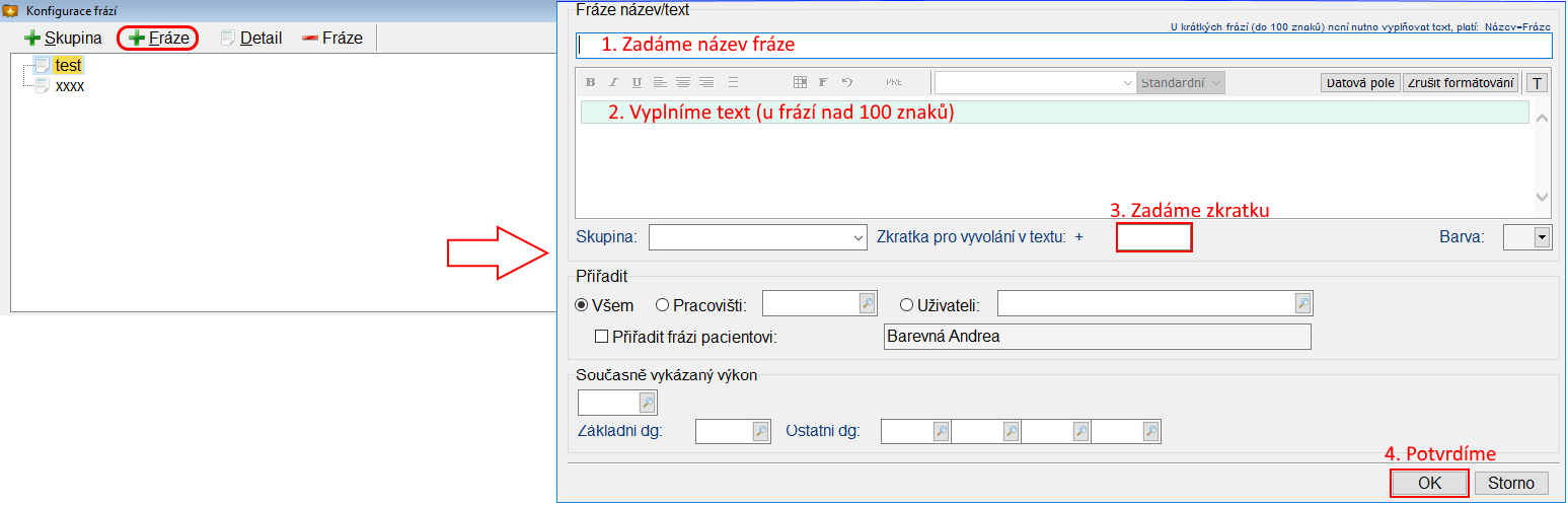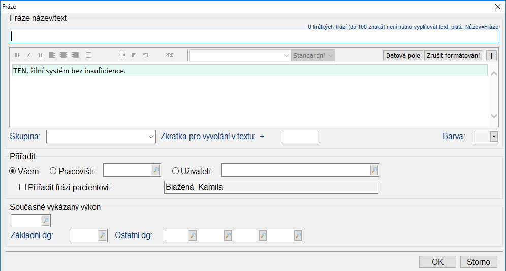 Kliknutím na  Fráze přidáme novou frázi. V následujícím okně v editačním poli vypíšeme název, případně text, zkratku a následně můžeme frázi přiřadit ke skupině, nebo určitému pracovišti.