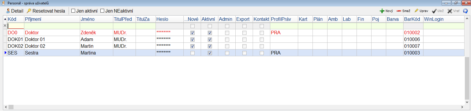 Prostřednictvím formuláře vyvolaného přes nabídku Konfigurace/Personál lze spravovat uživatele pracující se systémem. V Konfigurace personálu klikneme na  Nový, zadáme zkratku pracovníka do pole Kód, příjmení, jméno, případně titul. Heslo nemusíme vyplňovat, program sám vyzve nového pracovníka k vytvoření a zadání přihlašovacího hesla při prvním přihlášení. Tuto funkci umožňuje ponechání zatržítka v poli  Nové...