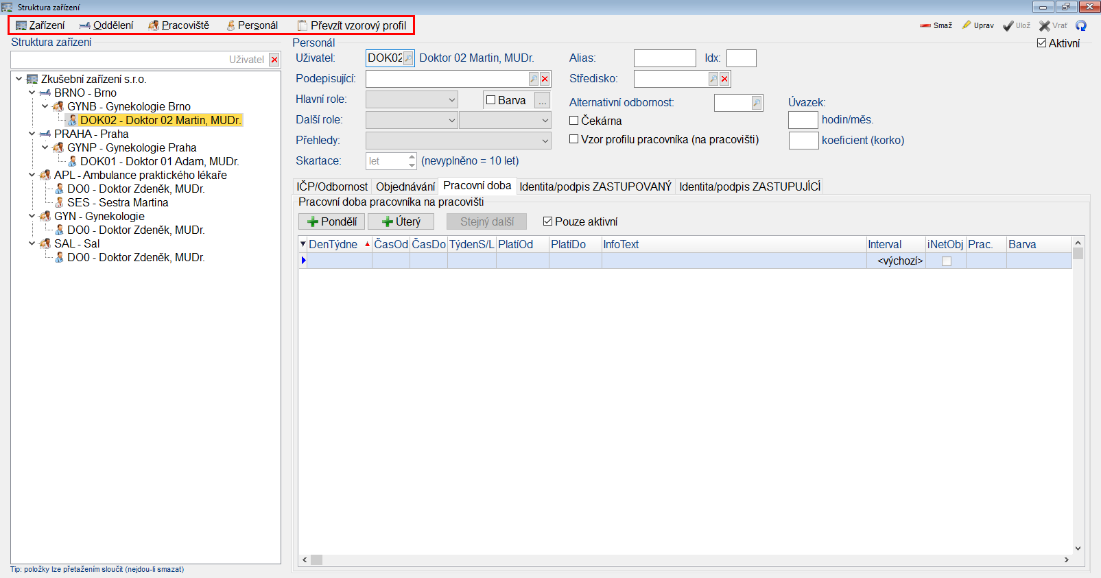 Kliknutím na tlačítka   Zařízení,  Oddělení,  Pracoviště vytvoříme zcela nové subjekty. Zařízení je kořenovým prvkem celé struktury. U dalších položek záleží při zakládání na aktuálním postavení – nové položky se vytvářejí pod aktuálně zvolenou položkou.
