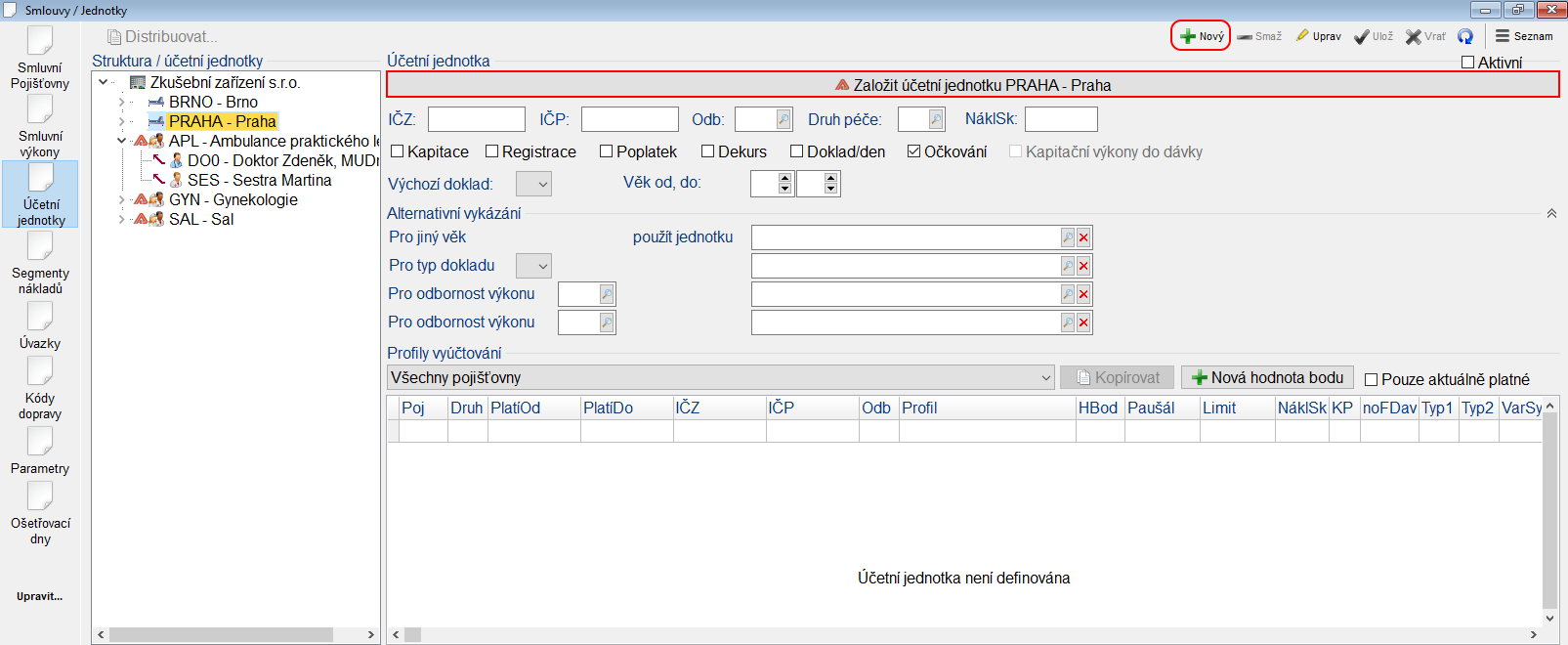 Kliknutím na pracoviště (případně jinou položku) ve stromové struktuře nastavíme pracoviště (zařízení, oddělení, personál), kde chceme vytvořit účetní jednotku. Pokud ještě není účetní jednotka definována, zobrazí se nám tlačítko Založit účetní jednotku, na které klikneme. Založení nového záznamu můžeme udělat i přes tlačítko Nový, nebo klávesou Insert.