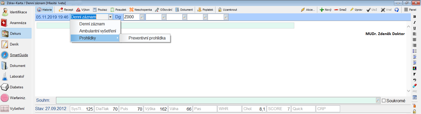 Novou prohlídku založíme přes Karta pacienta → Dekurs → Nový záznam → Výběr dokumentu → Prohlídky →"zvolená předloha".