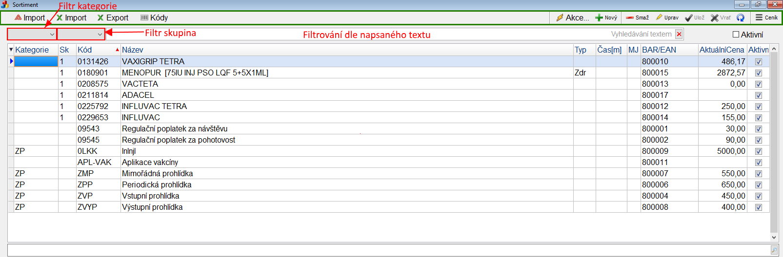 - Aktivní - označuje položky, které mají být zobrazeny v číselníku sortimentu, v základním nastavení se zobrazí jako aktivní