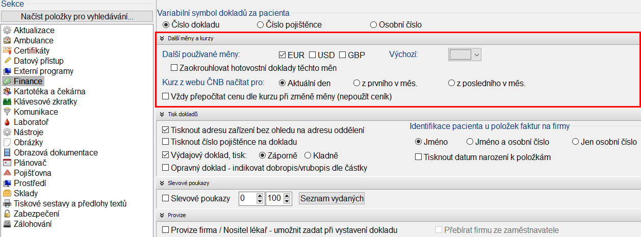 Finance slouží k vyúčtování hotovostních plateb za služby, zákroky, léky, pomůcky poskytované pacientům.