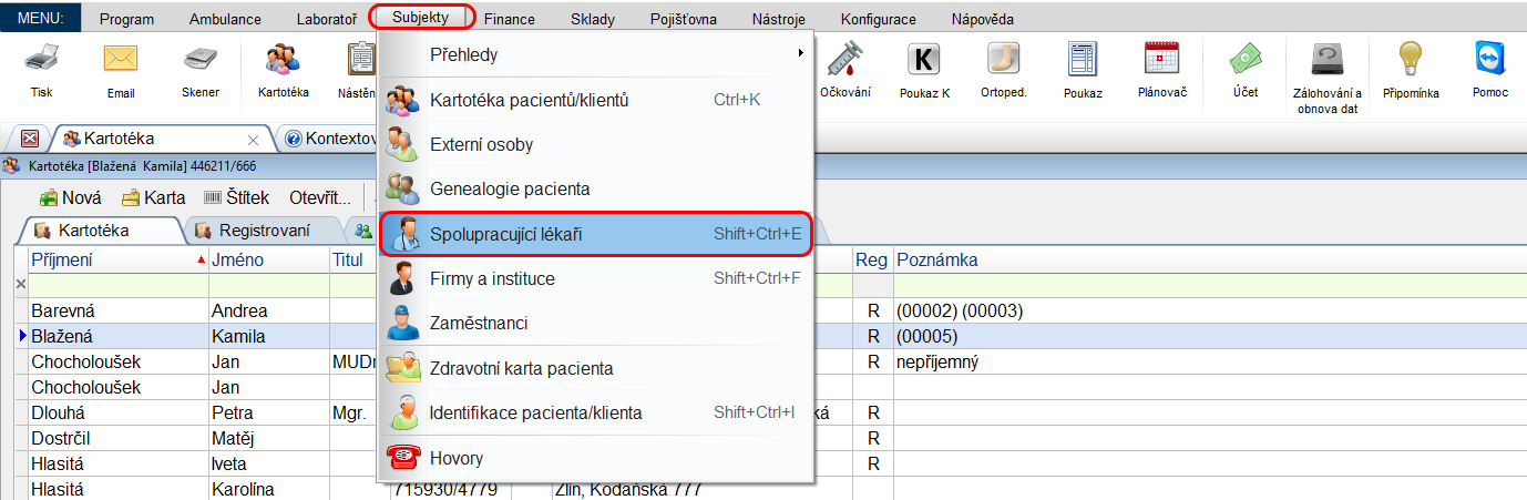 Do seznamu se dostaneme přes Subjekty -> Spolupracující lékaři, nebo přes klávesovou zkratku Shift+Ctrl+E.