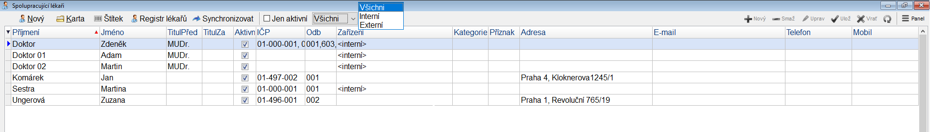 Následně se nám otevře seznam spolupracujících lékařů. Lékaře můžeme filtrovat na základě toho, zda jsou aktivní, nebo po rozkliknutí kolonky Všichni dle interních a externích. Kartu již zadaného lékaře otevřeme dvojklikem na označený řádek, nebo kliknutím na tlačítko