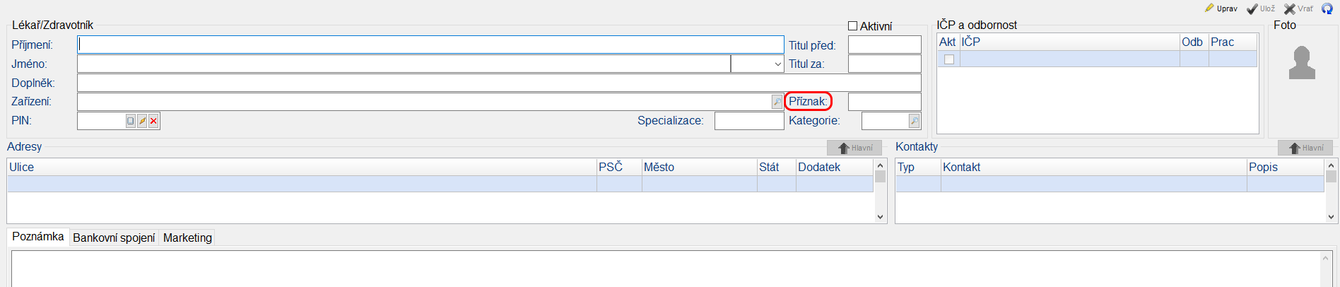 Pokud využíváme pro vyplnění požadujícího lékaře ve speciálním vyšetření - cytologie kód lékaře, je třeba tento kód zadat v identifikační kartě lékaře do pole Příznak.