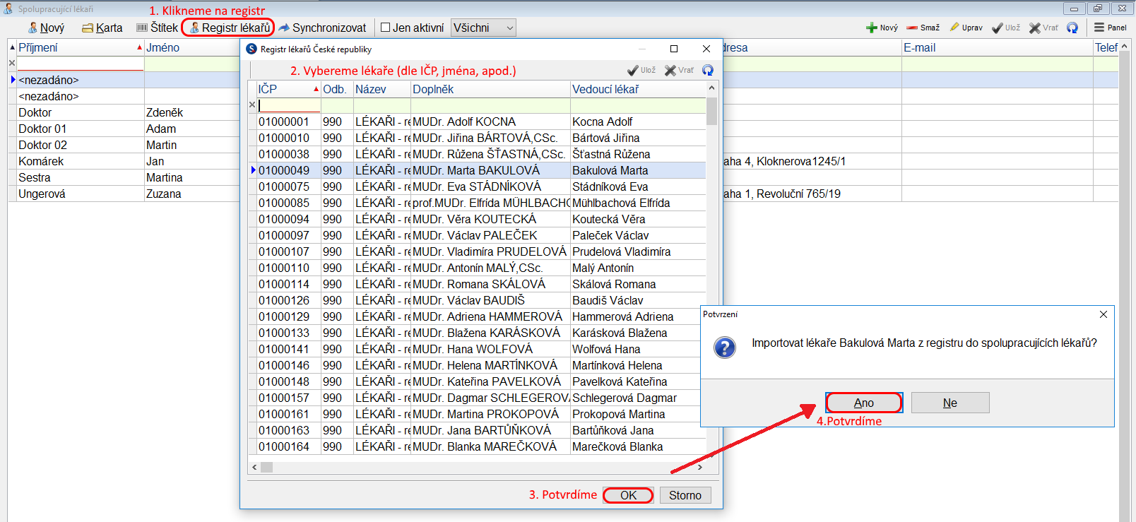 Registr lékařů se nám otevře Registr lékařů České republiky, kde vyhledáme lékaře dle názvu, jména či IČP. Po výběru lékaře a potvrzení pomocí tlačítka OK se nás program zeptá, zda chceme lékaře importovat do seznamu spolupracujících lékařů, po kliknutí na ANO bude lékař přidán. Z registru je možné přidat pouze lékaře, který má smlouvu s VZP.
