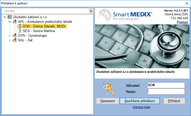 U zařízení s více pracovníky, pracovišti, složitou strukturou nebo v případě, že se chceme přihlásit pod jiným uživatelem, než je aktuálně vybrán, zadáme zkratku daného uživatele nebo klikneme na Rozšířené přihlášení. Ve struktuře, která se nám následně zobrazí v levé části, vybereme odpovídající oddělení/pracoviště a dvojklikem zobrazíme přiřazené pracovníky. Vybereme uživatele, ke kterému se chceme přihlásit a zadáme heslo (pokud jej daný uživatel používá).
