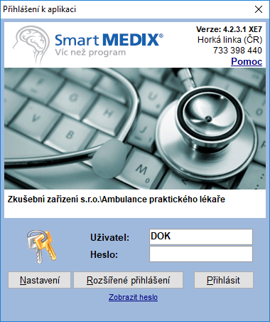 Po spuštění programu SmartMEDIX se na monitoru zobrazí přihlašovací dialogové okno viz.níže, se dvěma poli pro vyplnění: Uživatel a Heslo. Uživatelské jméno zastupuje zkratka tří až pěti písmen. Po spuštění programu se do pole Uživatel automaticky vyplňuje zkratka naposledy přihlášeného uživatele. Pokud chceme, aby se nám při psaní hesla zobrazovaly jednotlivé znaky, klikneme pod polem pro heslo na odkaz Zobrazit heslo.