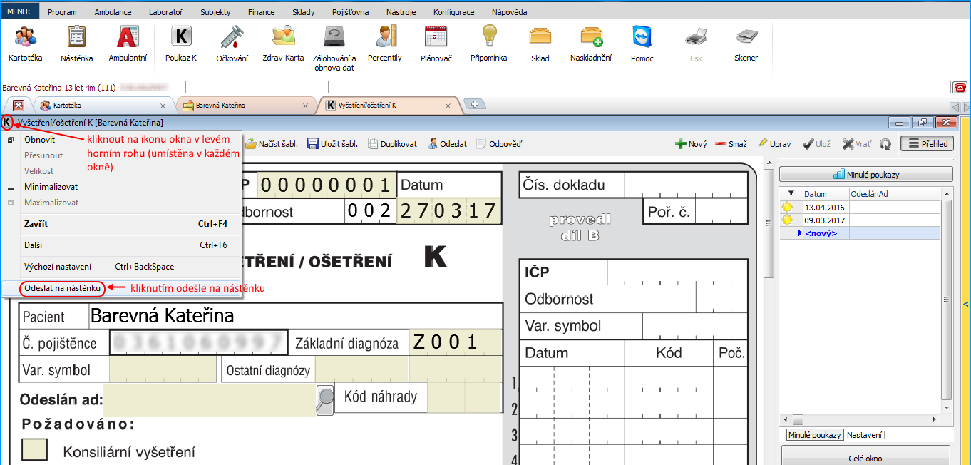 Novou zprávu na nástěnku je možné přidat třemi různými způsoby. Kromě zapsání nové zprávy přímo přes tlačítko nástěnky lze odeslat na nástěnku jakékoliv právě otevřené okno programu nebo odeslat záznam přes Deník , který je součástí karty pacienta.